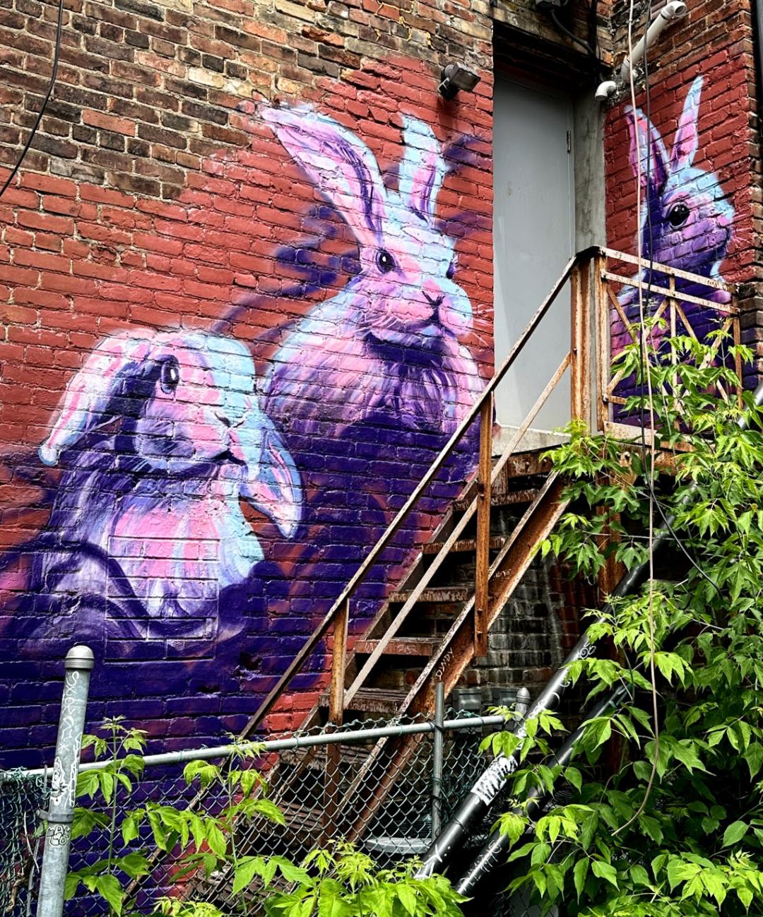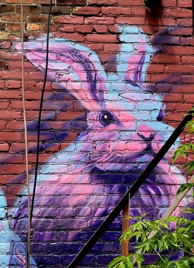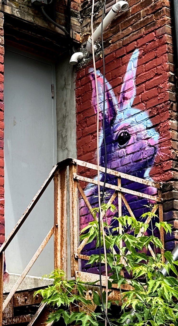 Ecila wandered black and white curves until she saw a pink alley. In the alley was a Purple Pink Rabbit. “Hello! What’s your name, and can you please show me the door out of here?”