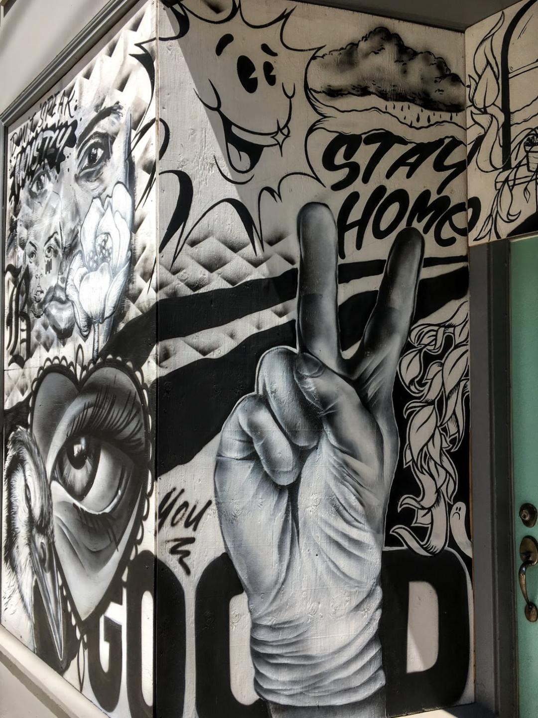 I’ve decided to grow out my grey hair. That thing in the centre of my chest is a bottle of hand sanitizer on a lanyard. I wear OS men’s shirts as a form of PPE. I hand painted my mask.