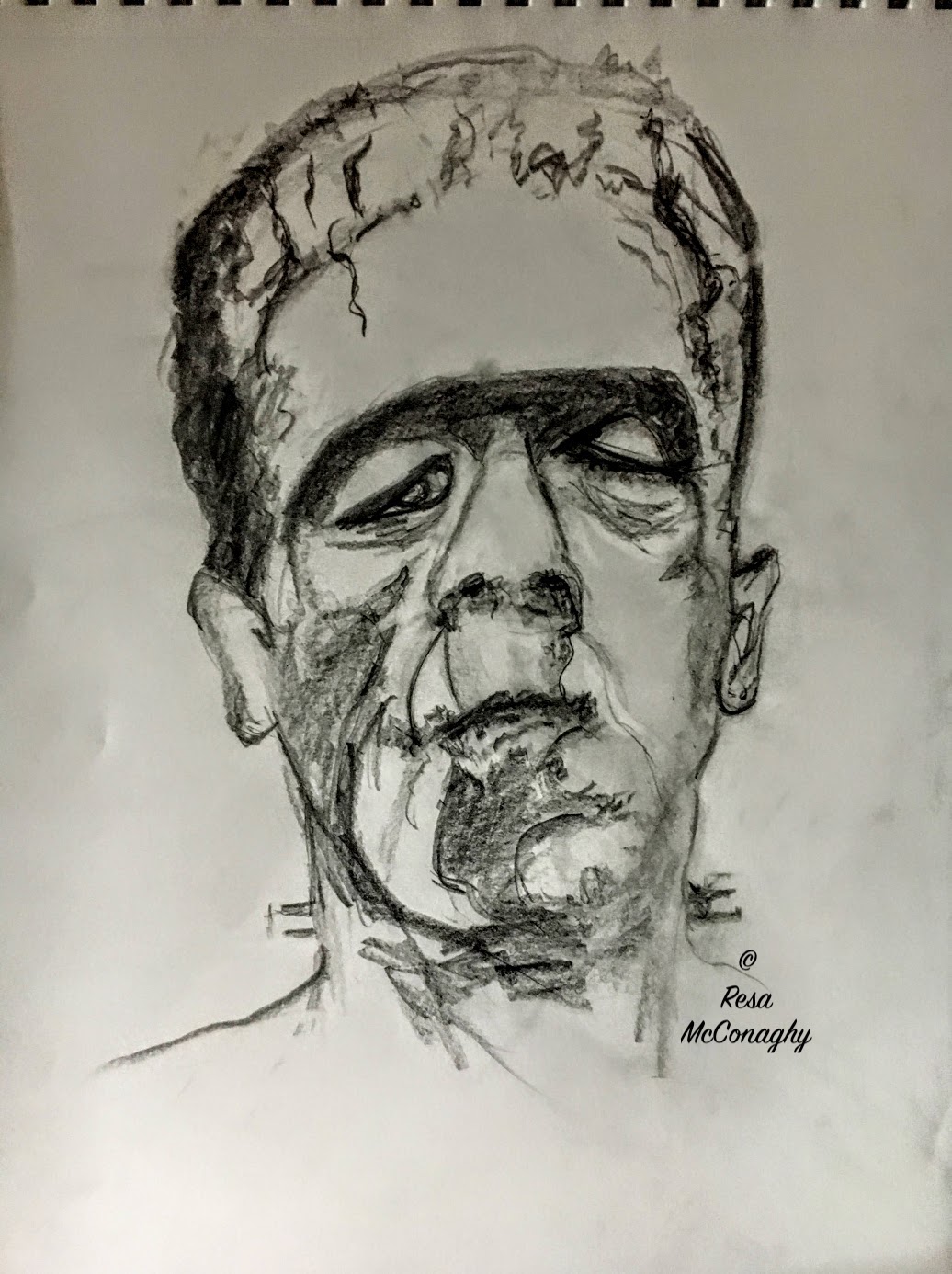 I got a commission to draw a pencil portrait of Frankenstein. Why not? I’m perfect for the job, as I draw a female super hero (Princess Blue Holly), a Torch Singer in Gowns, (Rene Rosso), Art Gowns Models in gowns, and a 1960’s Go-Go Dancer in cool mini dresses (Boogapony Holly).