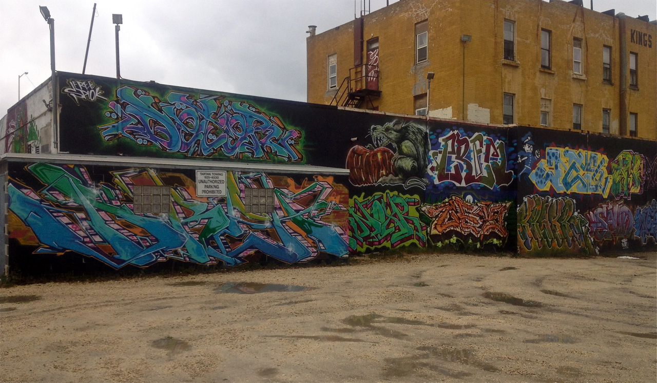 When I reached Higgins Avenue, I turned and captured the paintings from the other angle. Looking the other way down the alley, it’s another wanton view!