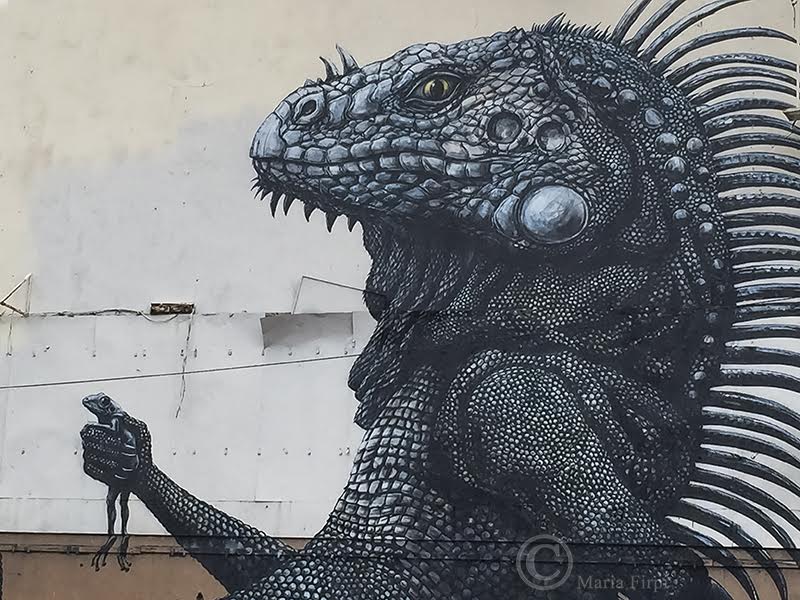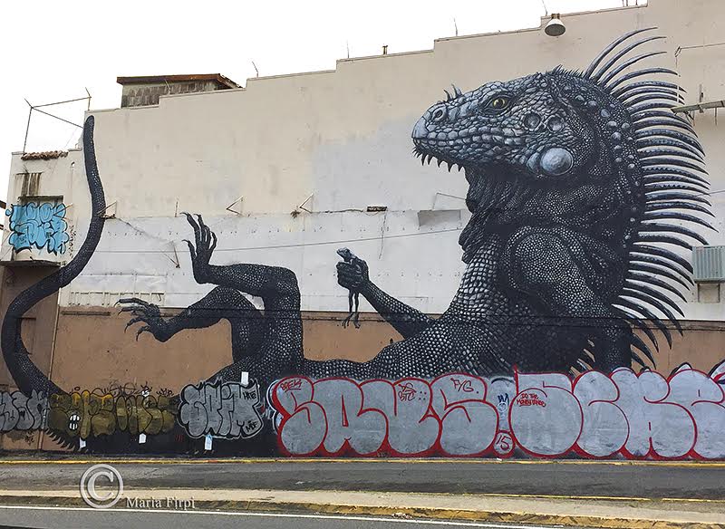 “This mural has very good technique. It depicts a Green Iguana, officially declared as an ‘invasive species’ on the island. The unknown artists of this mural painted the Iguana as a huge monster holding a Coqui Frog in its hand. “