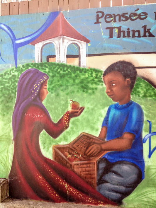 An old used easel, baskets, snowshoe, baseball mitt, license plate, violin, muffin tin, plaster head, rusty can, broken chair, wheel of sorts and is that a paper cup?
