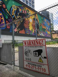 I found this in spring 2023. This mural runs along crumbling walls in an alley in Kensington Market.