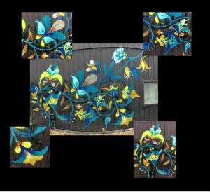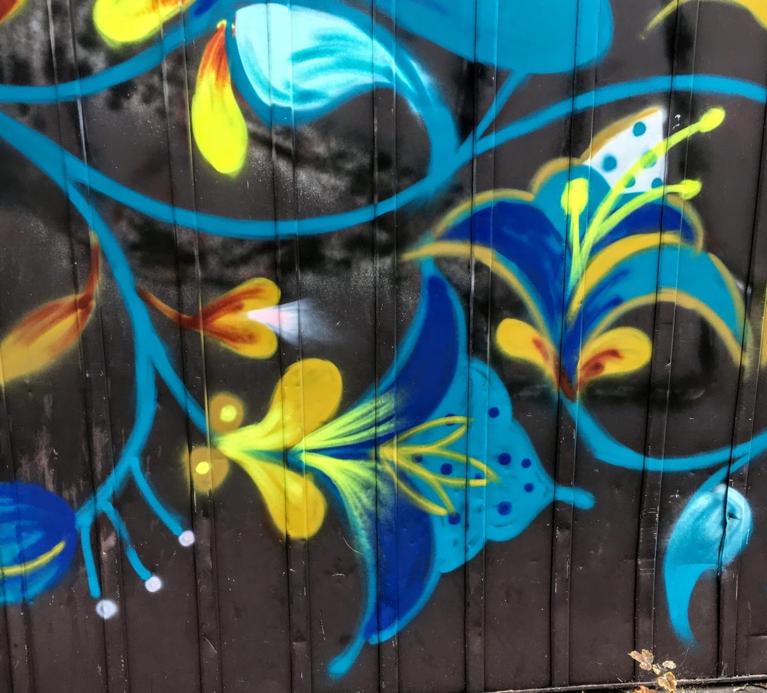 I was 10 poems into the book. Then, on one of my street art hunts, I came upon this mini-mural. There is a constant flowing of blue, with abstract flowers and leaves. I thought, this is like Merril’s book.