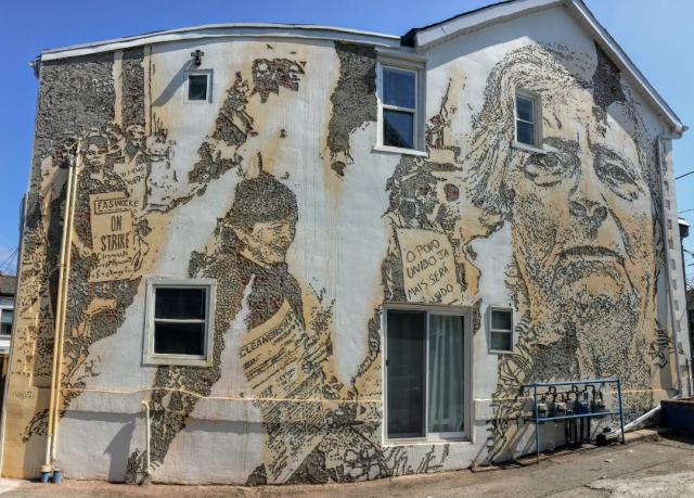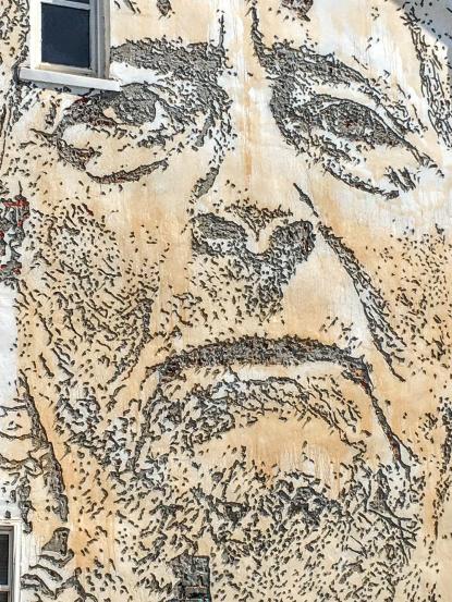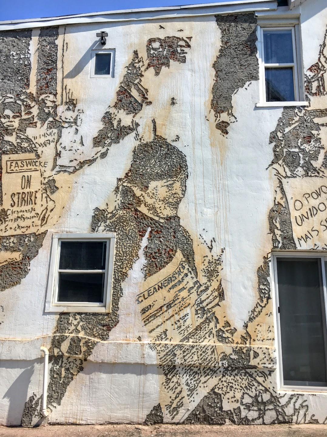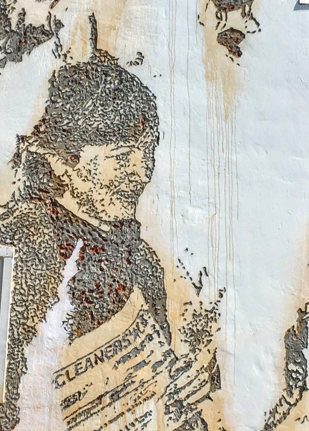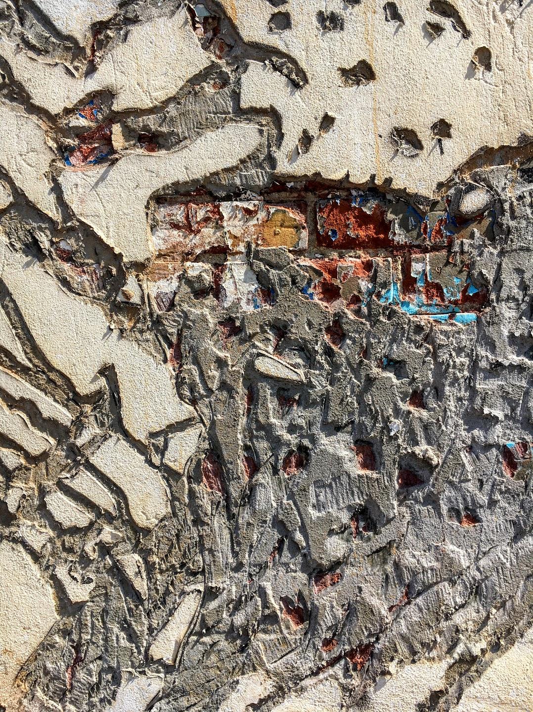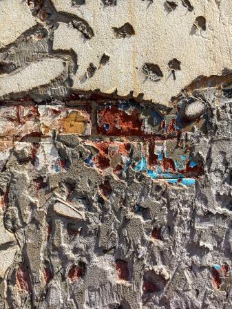 Not sure if the bits of colour are old layers of paint over the old brick, added at the end for effect or a combination of the two.